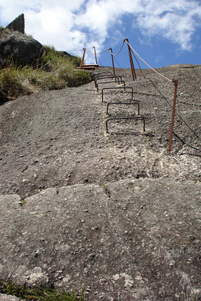 Saindo da mata a trilha corre paralela a uma cerca e a o final dela começa um trecho de rocha, sendo que no ponto mais íngreme foram colocados grampos de aço e um corrimão. |
